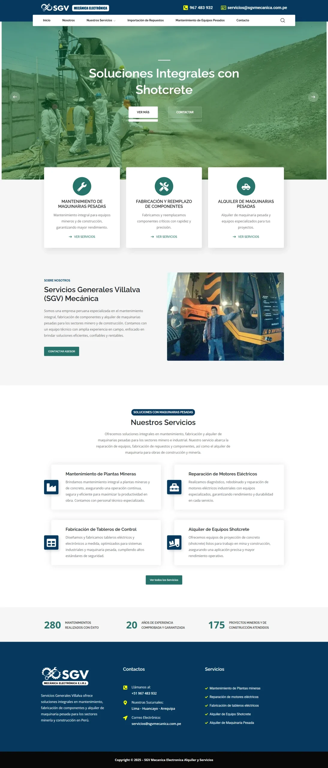 Desarrollamos el sitio web para SGV Mecánica, una empresa líder en servicios integrales para maquinaria pesada, minería y construcción en Perú. El sitio web fue diseñado con un enfoque profesional y funcional, destacando los principales servicios de la empresa como mantenimiento especializado, alquiler de maquinaria pesada y importación de repuestos de alta calidad, facilitando la navegación del usuario y mejorando la presencia online del negocio.