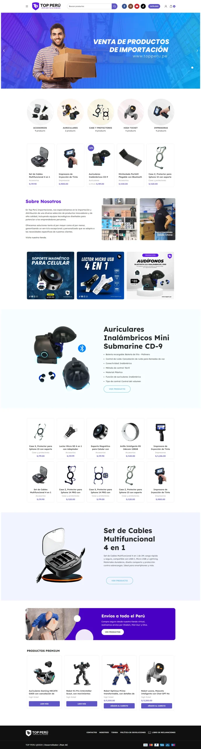 Desarrollamos la tienda virtual para TopPeru.pe, una plataforma de importaciones y comercio electrónico enfocada en ofrecer productos importados de alta calidad tanto al por mayor como al por menor. El sitio está diseñado para atraer a emprendedores y consumidores finales, presentando los productos de forma organizada, intuitiva y confiable, con un enfoque en facilitar la compra segura y mejorar la experiencia digital de los usuarios.